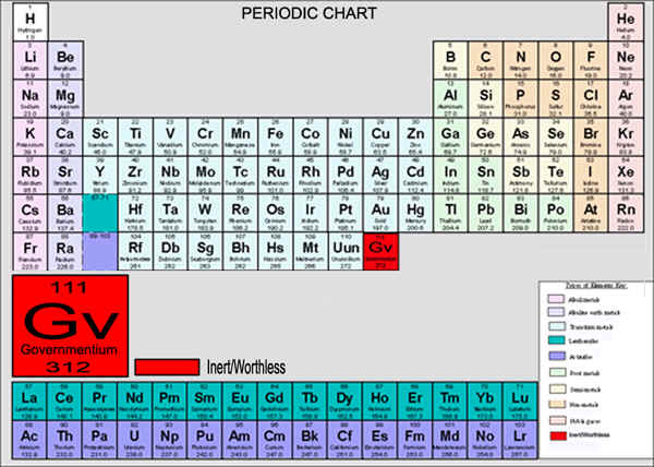 The new element, Governmentium (Gv), has one neutron, 25 assistant neutrons, 88 deputy neutrons, and 198 assistant deputy neutrons, giving it an atomic mass of 312.
